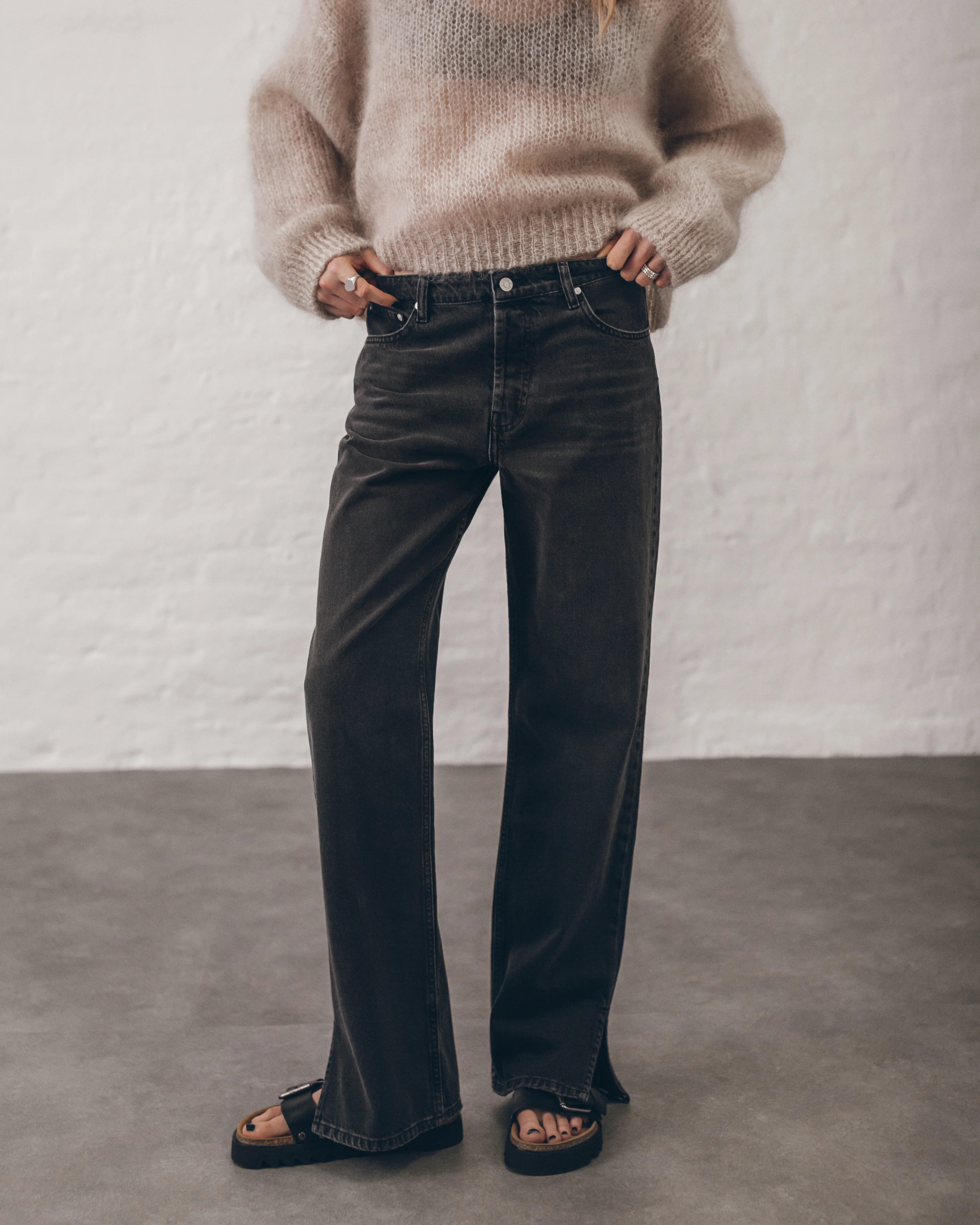 Low rise faded black jeans with straight leg fit and outer leg slit from ankle to hem.
