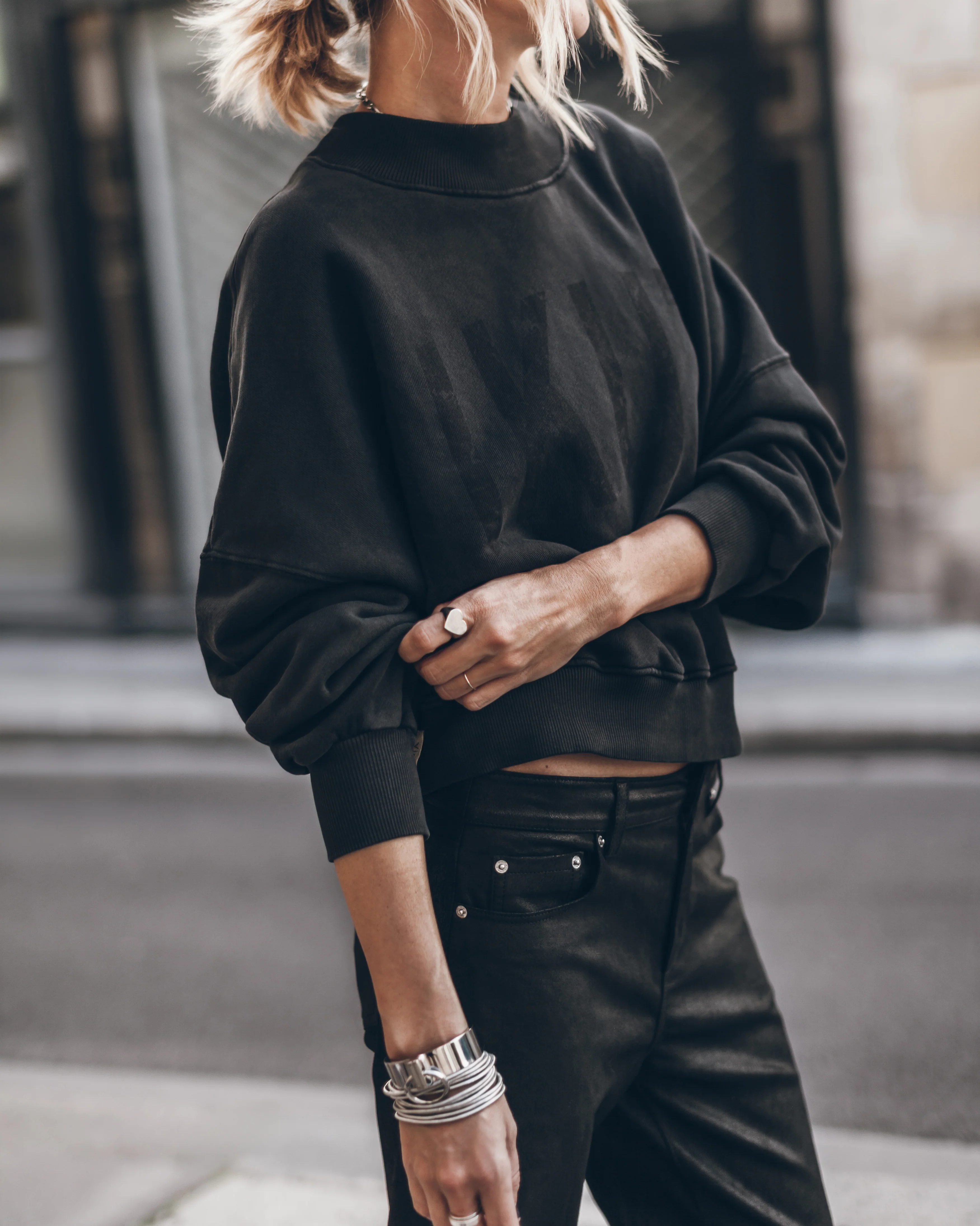 Oversized cotton sweater in charcoal black with a faded MIKUTA print.