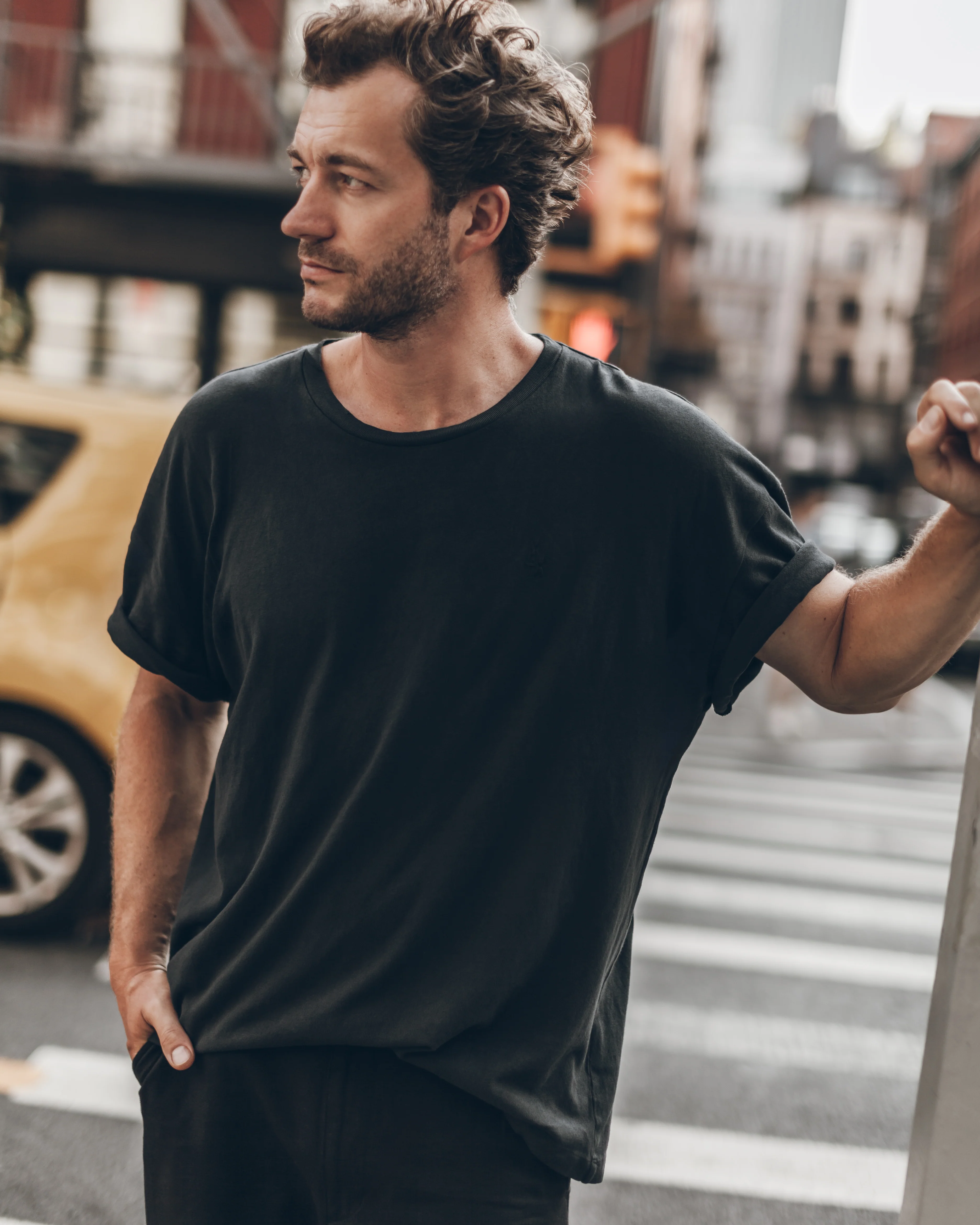 Oversized vintage inspired unisex cotton T-shirt in faded black with a MIKUTA embroidery on the chest. The T-shirt has distressed details on the collar and on the sleeves.