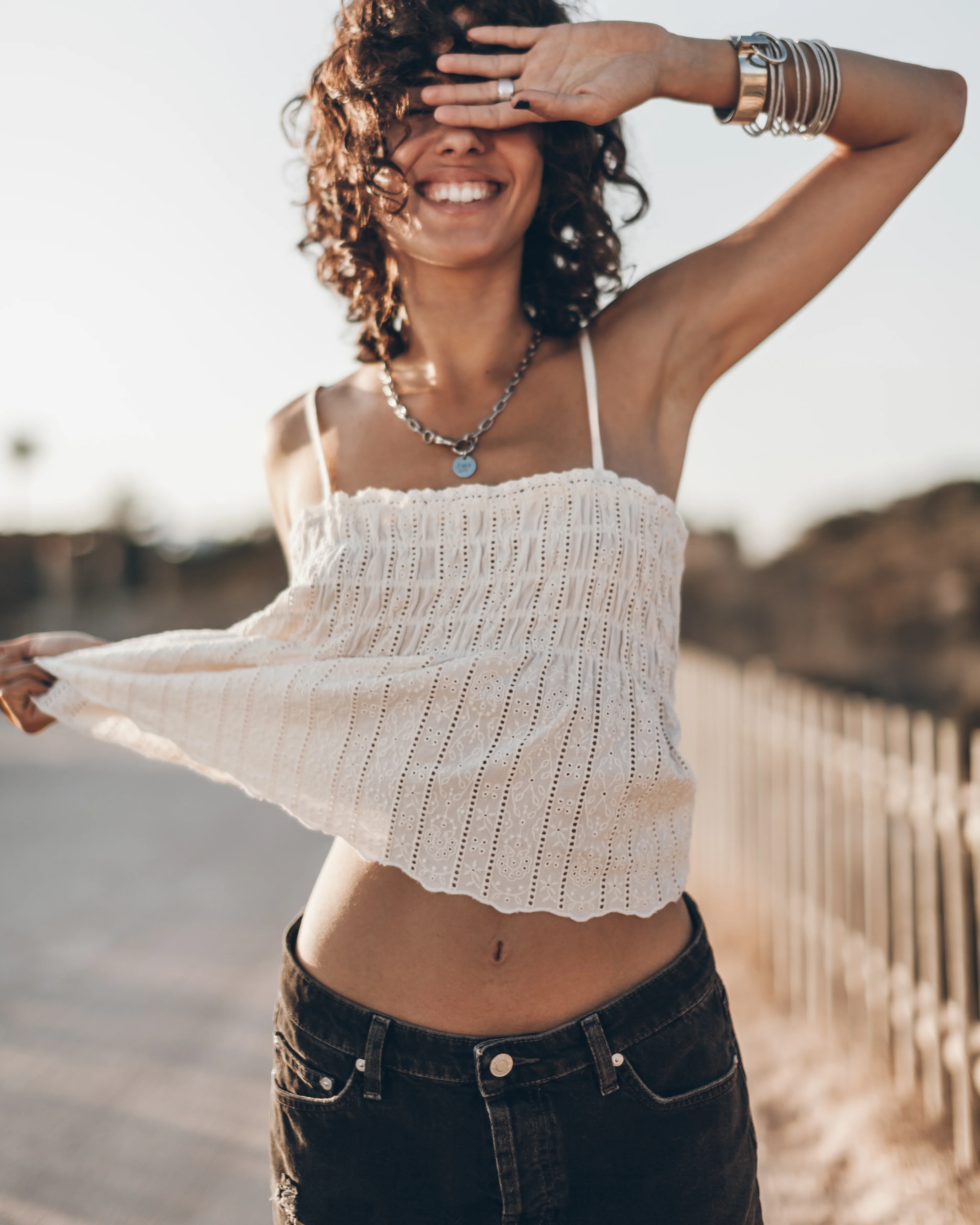 If you're looking to romanticize your every moment, throw on The Ecru Romantic Tank Top for an elevated date night, a long walk on the beach, or even a solo shopping trip. Delicate cotton eyelet detailing adorns every round edge hem and adjustable spaghetti straps allow for added comfort amid layers of softness.